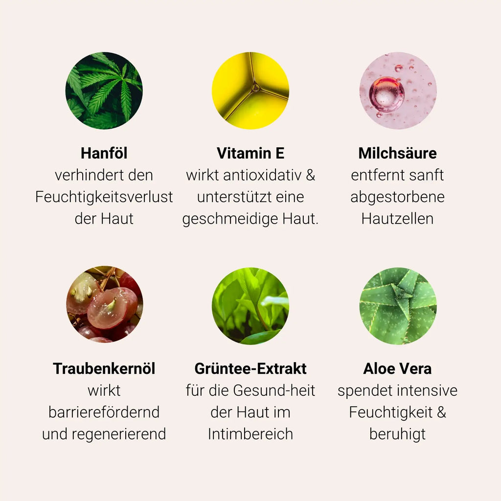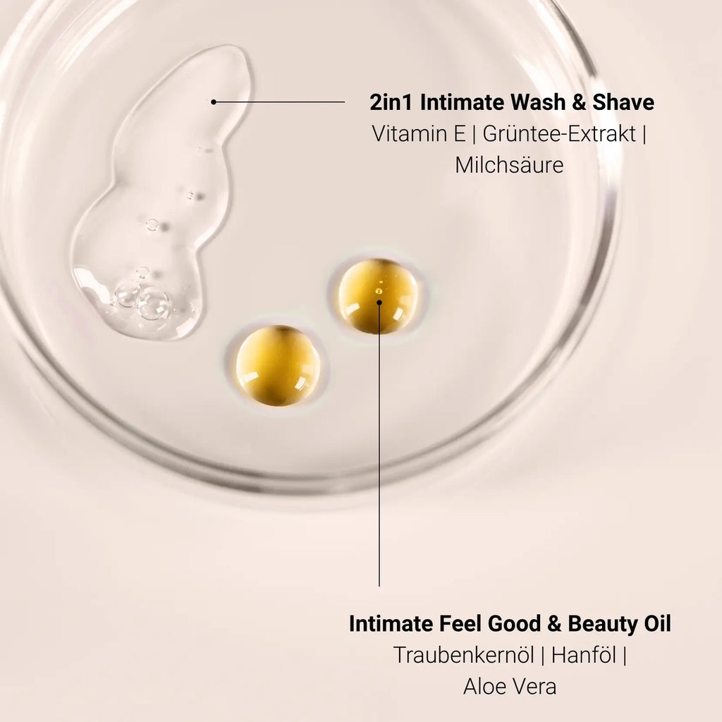 After cleansing and shaving, the unique Intimate Feel Good & Beauty Oil gives you an extra dose of care. The unique formula of 12 natural oils, with hemp oil, aloe vera and almond oil, helps you in all situations. Whether for daily care after cleansing, as an aftershave to prevent razor burn and ingrown hairs, or to combat feelings of dryness - enjoy silky-soft skin all over your body and a healthy glow!