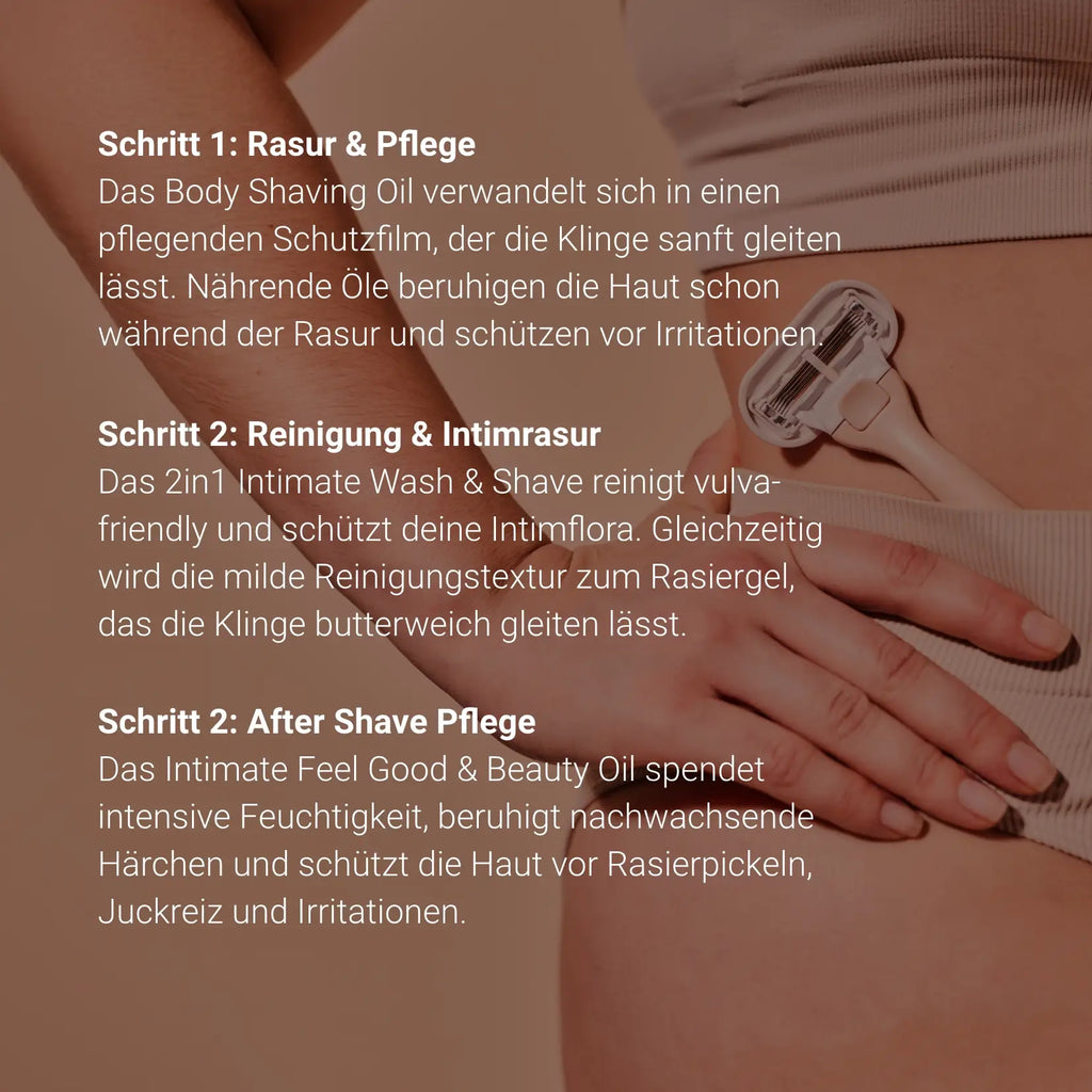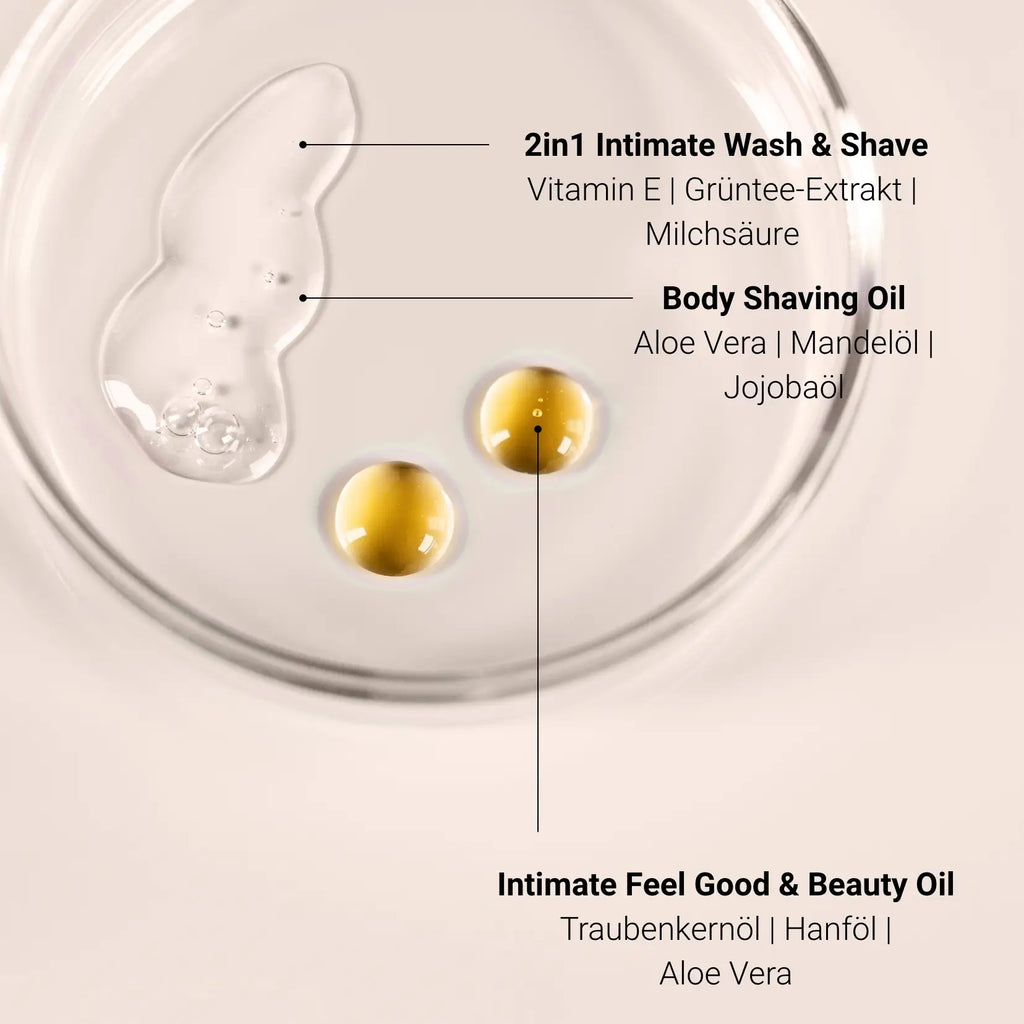 Das Body Shaving Oil ist etwas leichter als das Feel Good & Beauty Oil und auf die Nassrasur mit unserem Rasierer angepasst. Es erleichtert das Gleiten der Rasierklingen und pflegt die Haut gleichermassen, da es langsam einzieht. Das Intimate Feel Good & Beauty Oil ist sehr reichhaltig und etwas dicker, da es für die intensive Pflege des empfindlichen Intimbereichs gedacht ist. Als After-Shave Produkt ist es auf die dünne, rasurstrapazierte Haut des äusseren Intimbereichs angepasst.