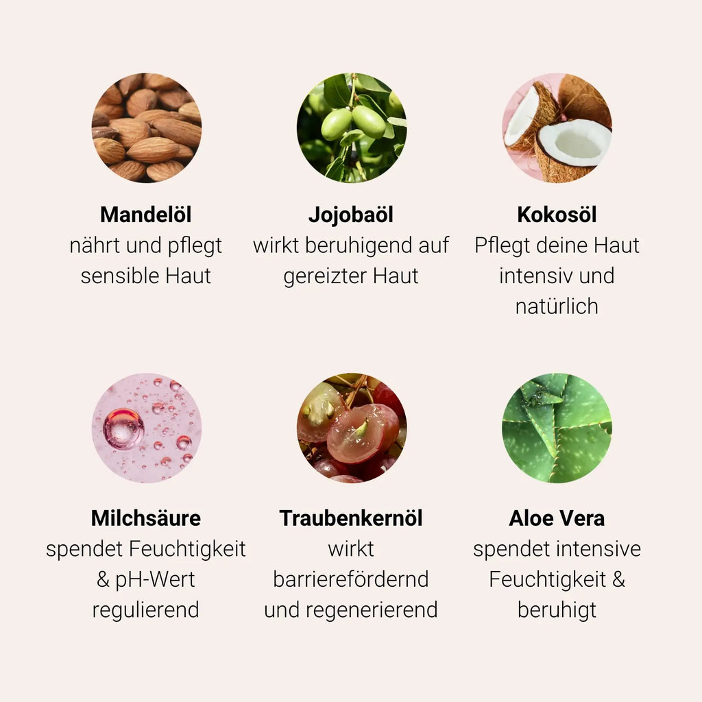 Nach der Reinigung und Rasur schenkt dir das einzigartige Intimate Feel Good & Beauty Oil eine Extraportion Pflege. Die einzigartige Formel aus 12 natürlichen Ölen, mit Hanföl, Aloe Vera und Mandelöl, hilft dir in allen Lebenslagen. Ob zur täglichen Pflege nach der Reinigung, als After Shave zum Verhindern von Rasurbrand und eingewachsenen Haaren, oder gegen Trockenheitsgefühle – geniesse ein seidenweiches Hautgefühl am gesamten Körper und einen gesunden Glow!